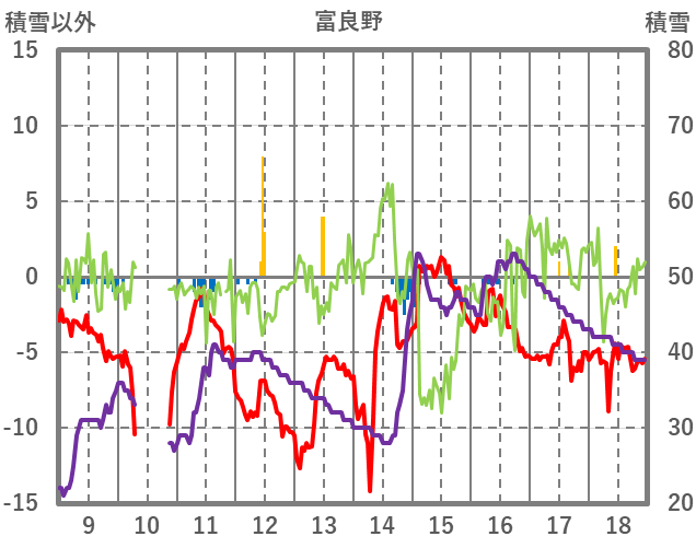 | 日 | 時 | 気温 | 降水 | 風向/風速 | 日照 | 積雪 | 降雪 |