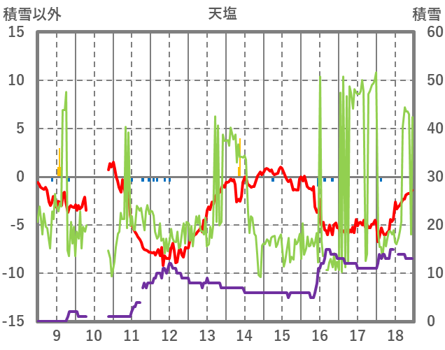 | 日 | 時 | 気温 | 降水 | 風向/風速 | 日照 | 積雪 | 降雪 |