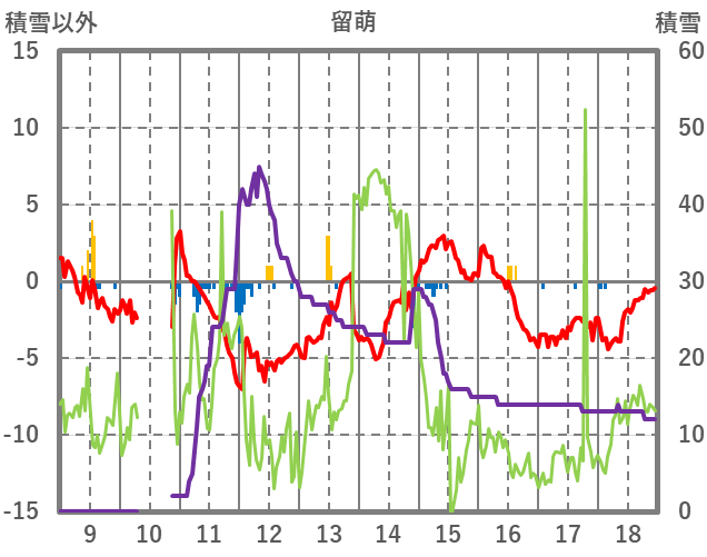 | 日 | 時 | 気温 | 降水 | 風向/風速 | 日照 | 積雪 | 降雪 |