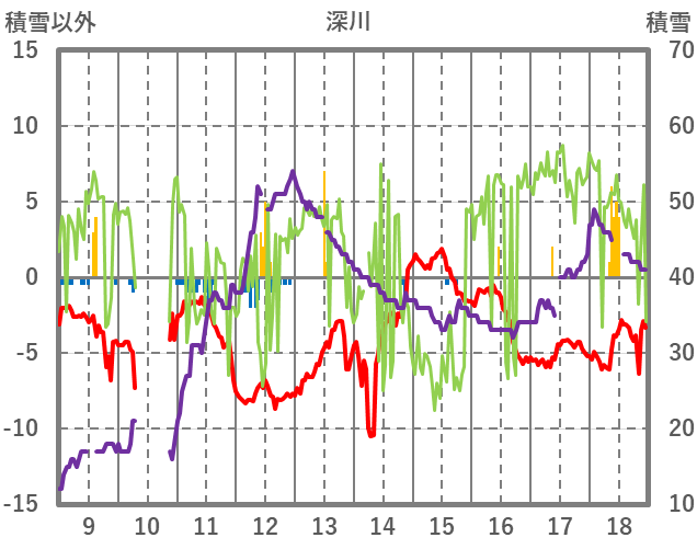 | 日 | 時 | 気温 | 降水 | 風向/風速 | 日照 | 積雪 | 降雪 |