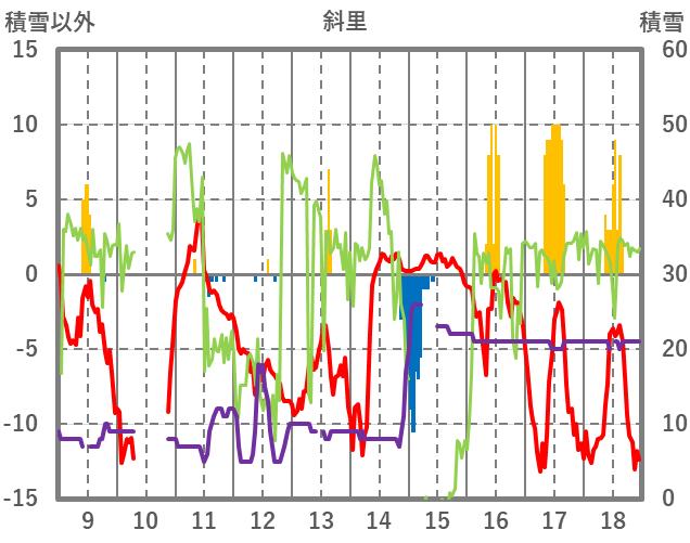 | 日 | 時 | 気温 | 降水 | 風向/風速 | 日照 | 積雪 | 降雪 |