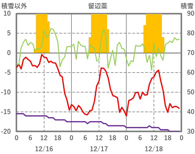 | 日 | 時 | 気温 | 降水 | 風向/風速 | 日照 | 積雪 | 降雪 |