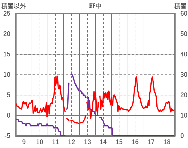 | 日 | 時 | 気温 | 降水 | 風向/風速 | 日照 | 積雪 | 降雪 |