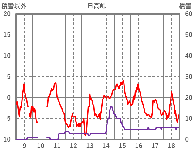 | 日 | 時 | 気温 | 降水 | 風向/風速 | 日照 | 積雪 | 降雪 |