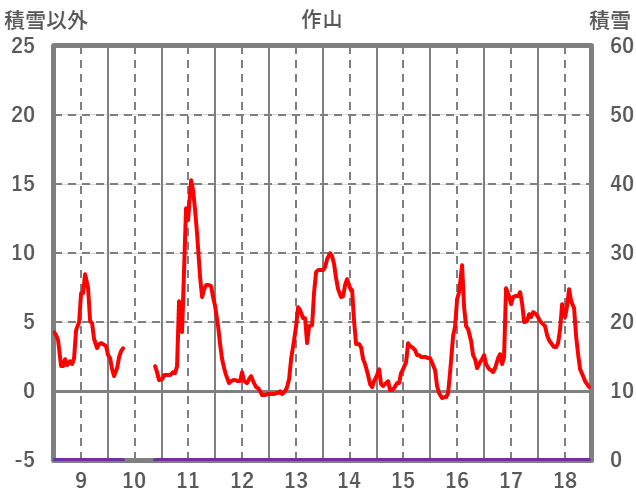 | 日 | 時 | 気温 | 降水 | 風向/風速 | 日照 | 積雪 | 降雪 |