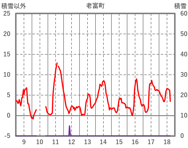 | 日 | 時 | 気温 | 降水 | 風向/風速 | 日照 | 積雪 | 降雪 |