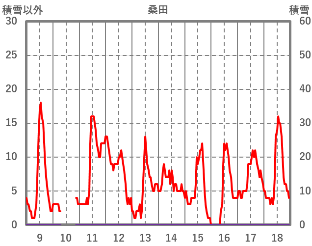 | 日 | 時 | 気温 | 降水 | 風向/風速 | 日照 | 積雪 | 降雪 |
