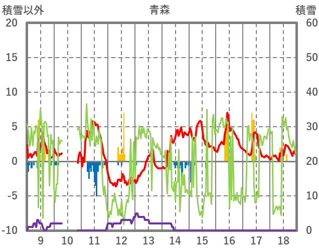 | 日 | 時 | 気温 | 降水 | 風向/風速 | 日照 | 積雪 | 降雪 |