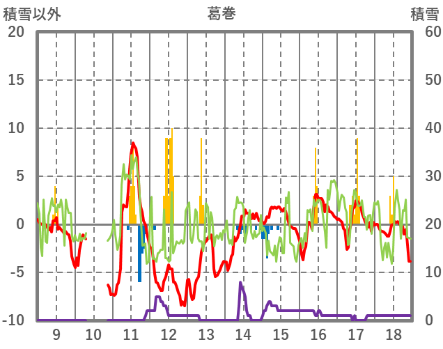 | 日 | 時 | 気温 | 降水 | 風向/風速 | 日照 | 積雪 | 降雪 |