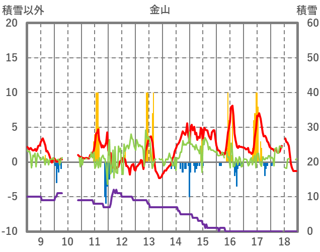 | 日 | 時 | 気温 | 降水 | 風向/風速 | 日照 | 積雪 | 降雪 |