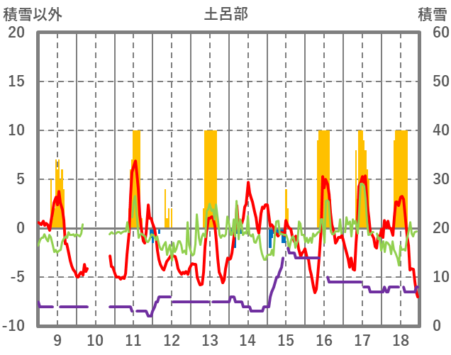 | 日 | 時 | 気温 | 降水 | 風向/風速 | 日照 | 積雪 | 降雪 |