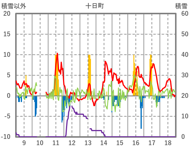 | 日 | 時 | 気温 | 降水 | 風向/風速 | 日照 | 積雪 | 降雪 |
