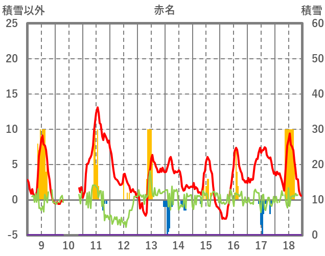 | 日 | 時 | 気温 | 降水 | 風向/風速 | 日照 | 積雪 | 降雪 |