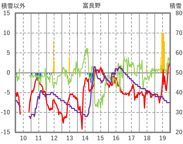 | 日 | 時 | 気温 | 降水 | 風向/風速 | 日照 | 積雪 | 降雪 |