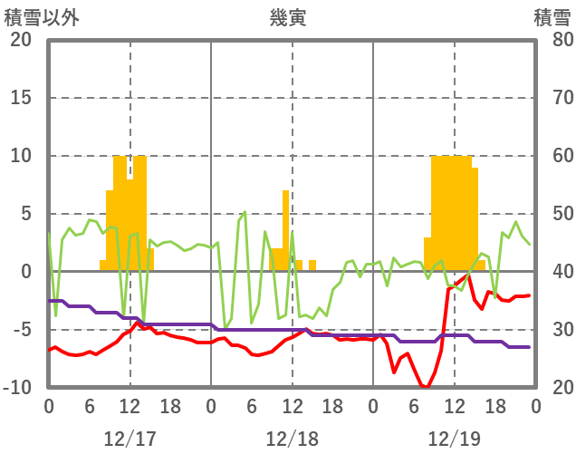 | 日 | 時 | 気温 | 降水 | 風向/風速 | 日照 | 積雪 | 降雪 |