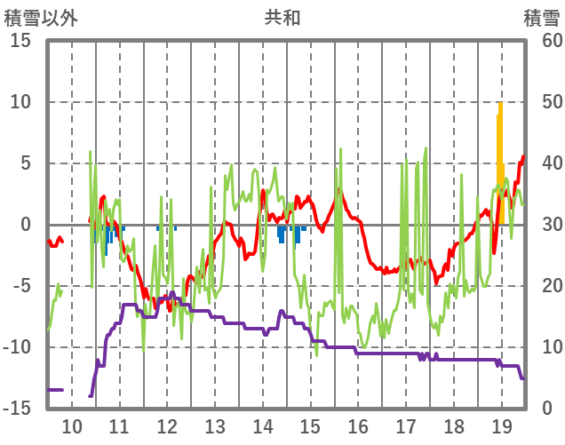 | 日 | 時 | 気温 | 降水 | 風向/風速 | 日照 | 積雪 | 降雪 |
