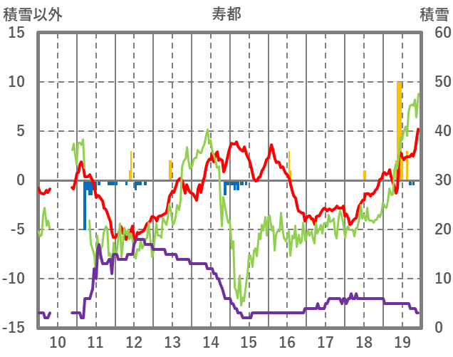 | 日 | 時 | 気温 | 降水 | 風向/風速 | 日照 | 積雪 | 降雪 |