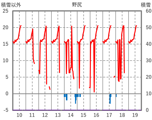 | 日 | 時 | 気温 | 降水 | 風向/風速 | 日照 | 積雪 | 降雪 |