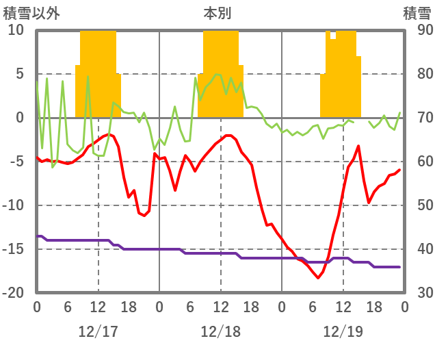 | 日 | 時 | 気温 | 降水 | 風向/風速 | 日照 | 積雪 | 降雪 |