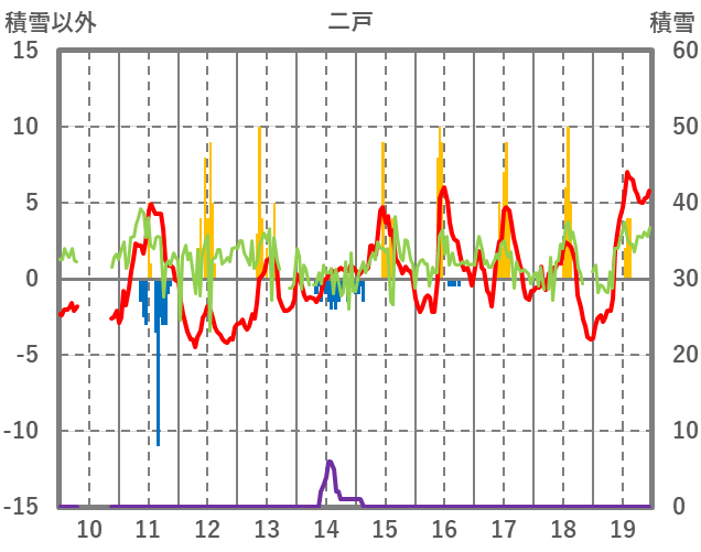 | 日 | 時 | 気温 | 降水 | 風向/風速 | 日照 | 積雪 | 降雪 |