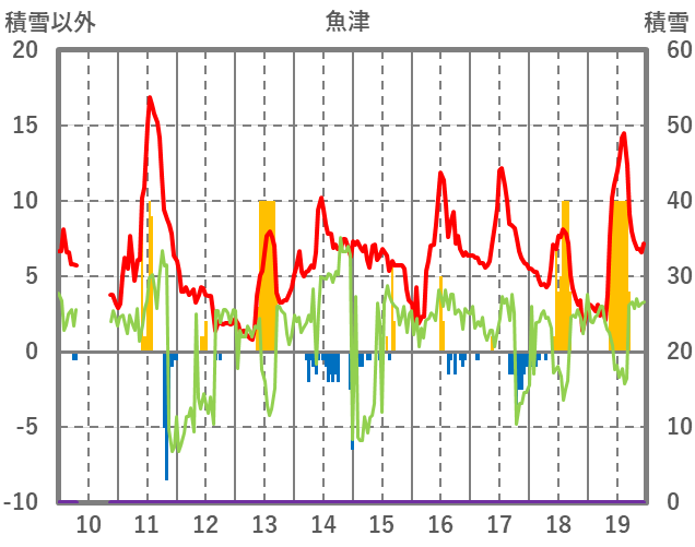 | 日 | 時 | 気温 | 降水 | 風向/風速 | 日照 | 積雪 | 降雪 |