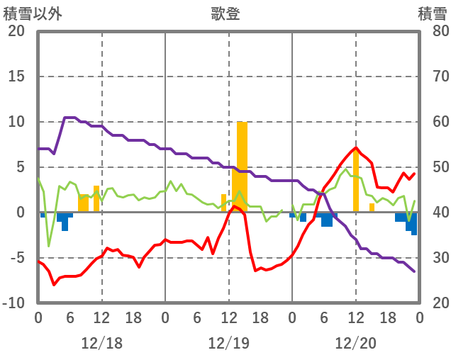 | 日 | 時 | 気温 | 降水 | 風向/風速 | 日照 | 積雪 | 降雪 |