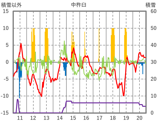 | 日 | 時 | 気温 | 降水 | 風向/風速 | 日照 | 積雪 | 降雪 |