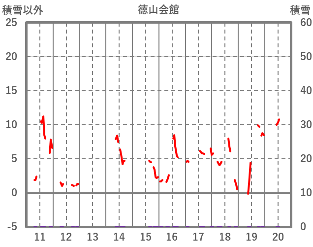| 日 | 時 | 気温 | 降水 | 風向/風速 | 日照 | 積雪 | 降雪 |