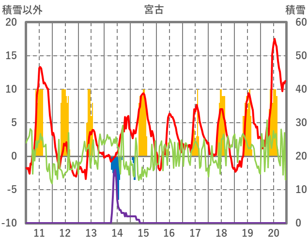 | 日 | 時 | 気温 | 降水 | 風向/風速 | 日照 | 積雪 | 降雪 |