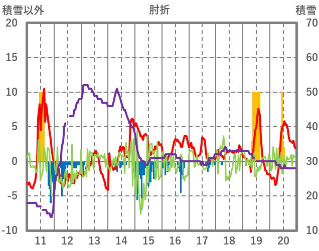 | 日 | 時 | 気温 | 降水 | 風向/風速 | 日照 | 積雪 | 降雪 |