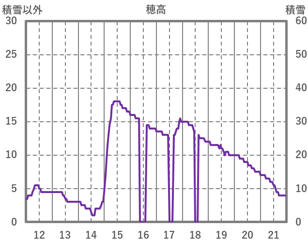 | 日 | 時 | 気温 | 降水 | 風向/風速 | 日照 | 積雪 | 降雪 |