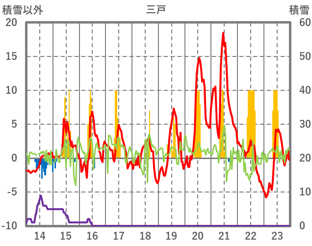 | 日 | 時 | 気温 | 降水 | 風向/風速 | 日照 | 積雪 | 降雪 |