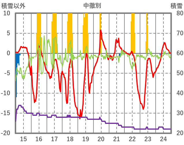 | 日 | 時 | 気温 | 降水 | 風向/風速 | 日照 | 積雪 | 降雪 |