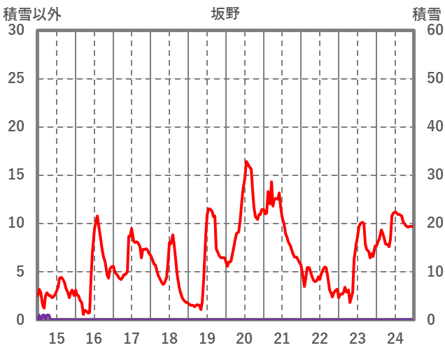 | 日 | 時 | 気温 | 降水 | 風向/風速 | 日照 | 積雪 | 降雪 |