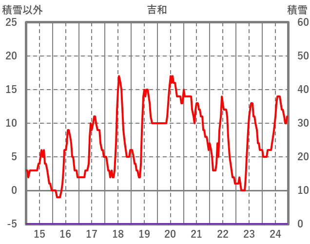 | 日 | 時 | 気温 | 降水 | 風向/風速 | 日照 | 積雪 | 降雪 |