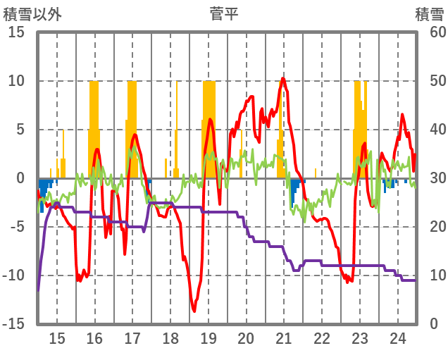 | 日 | 時 | 気温 | 降水 | 風向/風速 | 日照 | 積雪 | 降雪 |