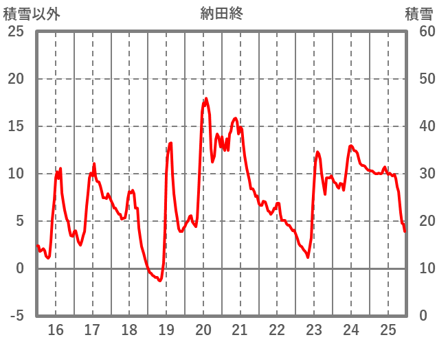 | 日 | 時 | 気温 | 降水 | 風向/風速 | 日照 | 積雪 | 降雪 |