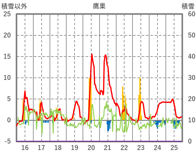 | 日 | 時 | 気温 | 降水 | 風向/風速 | 日照 | 積雪 | 降雪 |