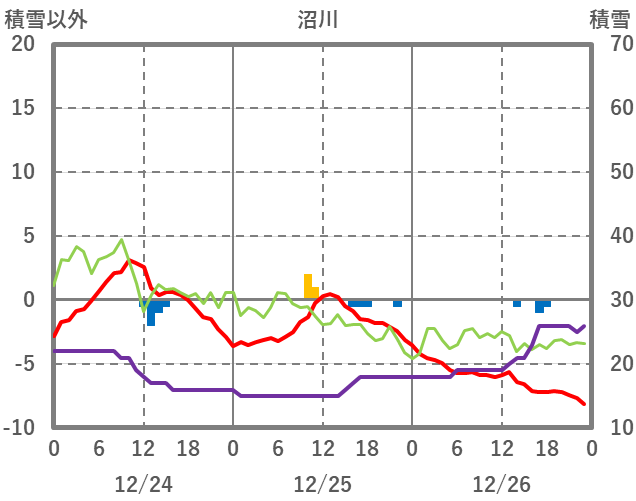 | 日 | 時 | 気温 | 降水 | 風向/風速 | 日照 | 積雪 | 降雪 |