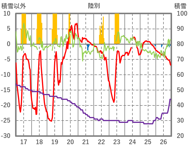 | 日 | 時 | 気温 | 降水 | 風向/風速 | 日照 | 積雪 | 降雪 |