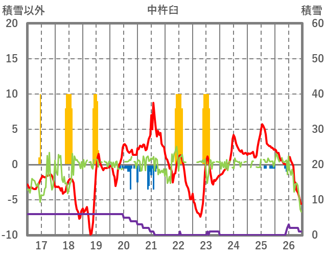 | 日 | 時 | 気温 | 降水 | 風向/風速 | 日照 | 積雪 | 降雪 |