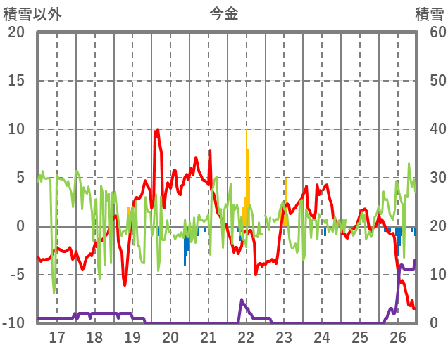 | 日 | 時 | 気温 | 降水 | 風向/風速 | 日照 | 積雪 | 降雪 |