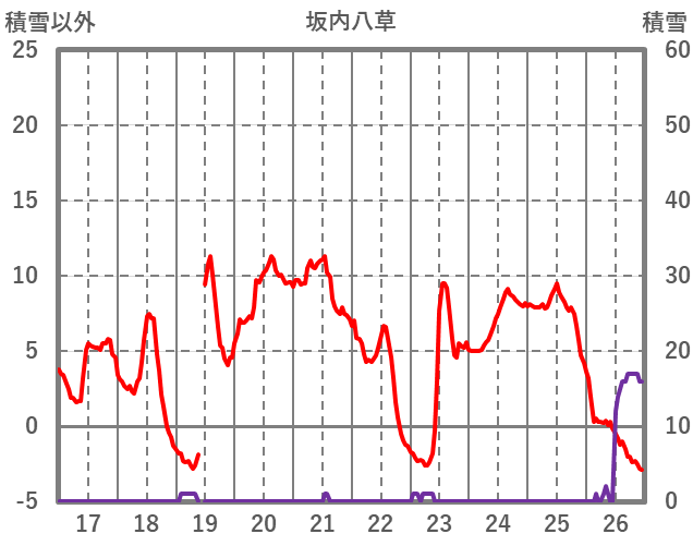 | 日 | 時 | 気温 | 降水 | 風向/風速 | 日照 | 積雪 | 降雪 |