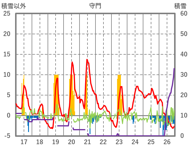 | 日 | 時 | 気温 | 降水 | 風向/風速 | 日照 | 積雪 | 降雪 |