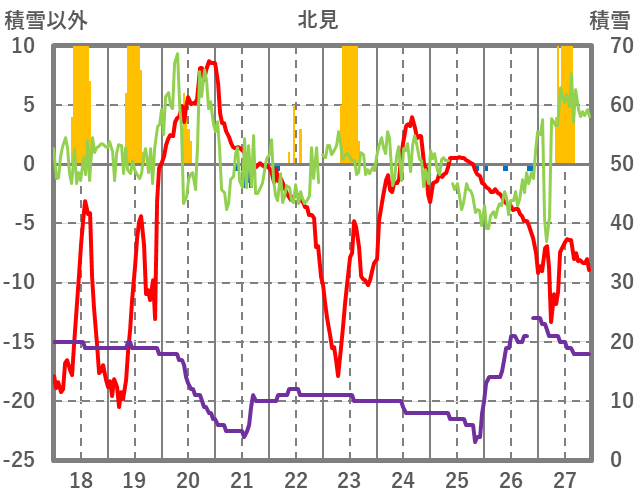 | 日 | 時 | 気温 | 降水 | 風向/風速 | 日照 | 積雪 | 降雪 |