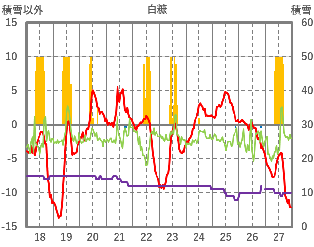 | 日 | 時 | 気温 | 降水 | 風向/風速 | 日照 | 積雪 | 降雪 |