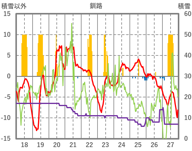 | 日 | 時 | 気温 | 降水 | 風向/風速 | 日照 | 積雪 | 降雪 |
