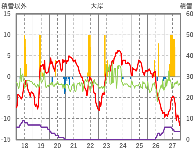 | 日 | 時 | 気温 | 降水 | 風向/風速 | 日照 | 積雪 | 降雪 |
