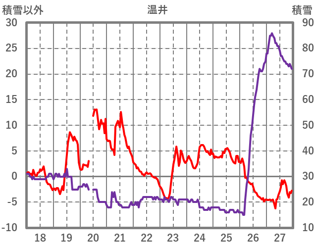 | 日 | 時 | 気温 | 降水 | 風向/風速 | 日照 | 積雪 | 降雪 |