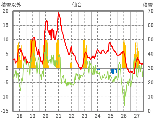 | 日 | 時 | 気温 | 降水 | 風向/風速 | 日照 | 積雪 | 降雪 |